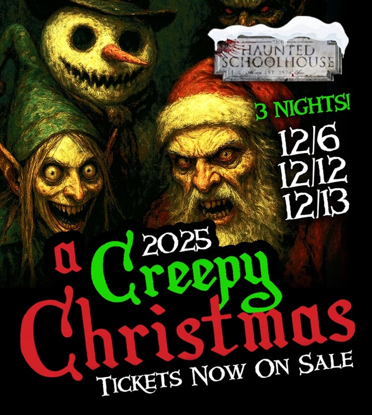 This December, the halls of the legendary Haunted Schoolhouse are transforming with the darkest holiday spirit. Step into a chilling world where twinkling lights hide twisted cheer and every corner holds a surprise. Encounter the mischievous Greenie Meanie, the terrifying Krampus, Evil Santa, and his army of Wicked Elves, along with countless other festive fiends lurking in the shadows. Prepare for a holiday experience full of spine-tingling scares, devious delights, and unforgettable encounters that will haunt your memories!